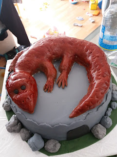 I started preparation about a week before her birthday. I baked the cake and made the dragon out of rice krispie treats. Real rice krispies are hard to find in Germany, but chocolate rice is easy to find, so I used that instead. I modelled the body, tail, head in a circular pattern. I didn't even want to try making it sit up, because the structure can be complicated, so the dragon was lying down.