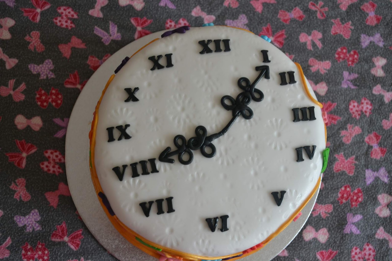 I extruded a few cords of black fondant and laid them on the cake, beginning in the middle of the clock, and making two loops near the end. Then I made a v-formation to act as the point of the arrow, and using some left over cords, I twisted them into a three-leaf clover and pressed it into the arrow. I made sure the clock read after eight o'clock, by the way. Can't have an After Eight Clock Cake that reads before eight o'clock!