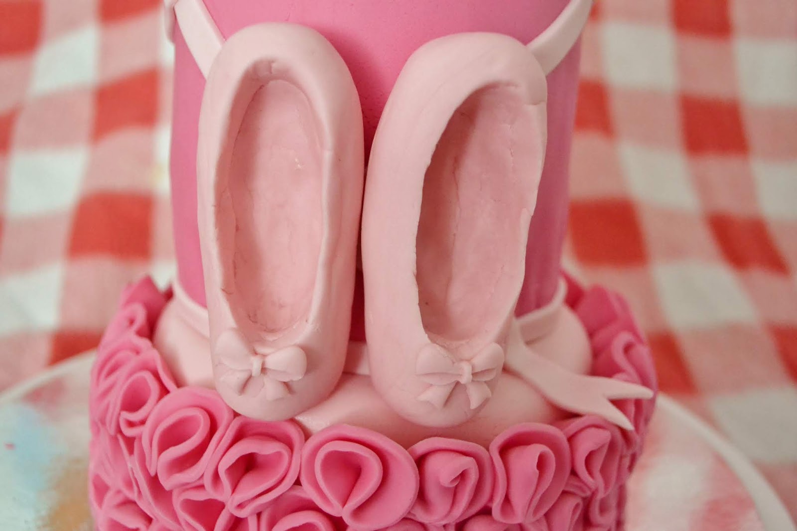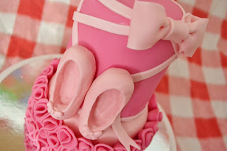 Then I placed the ballet slippers onto the cake. I also added a bow to the top and a little tail of ribbon onto the bottom tier.
