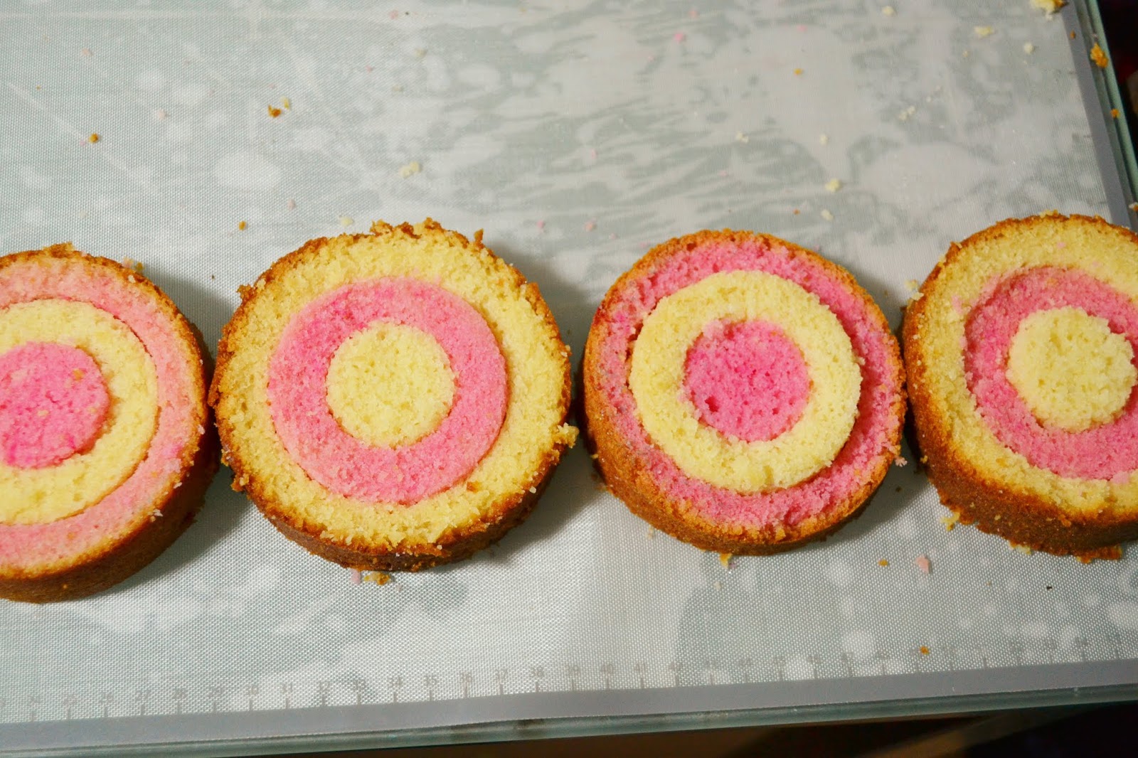 Now, alternate your colors of cake. If your outside ring is pink, the next color should be white and then pink on the inside.