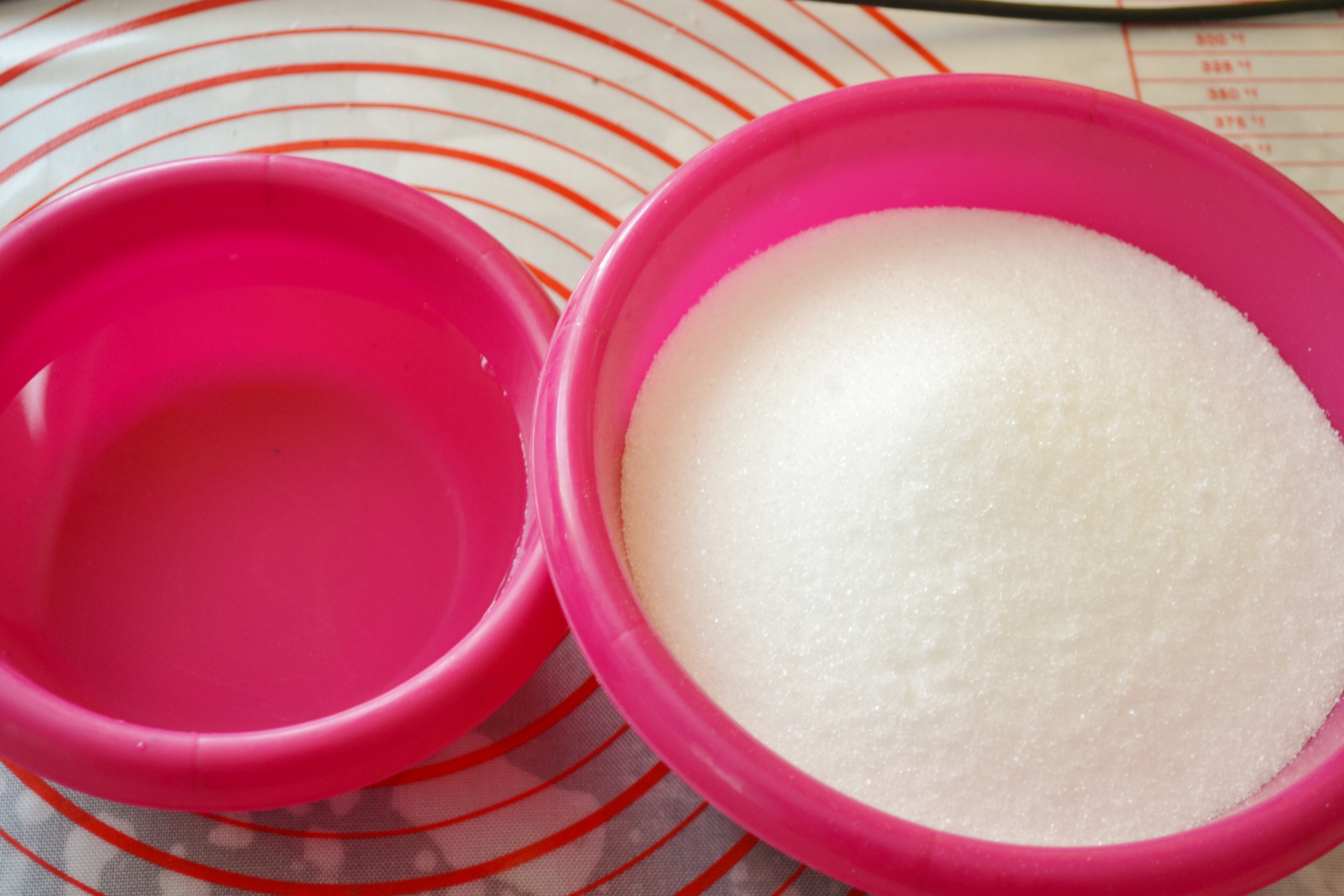 Then, in a saucepan, combine water and sugar. Heat over high heat and allow to boil until sugar syrup reaches hard crack. Keep a cup of cold water next to it to test the sugar syrup with. Stir at the beginning to combine the sugar and water, but do not stir after the syrup begins to boil.