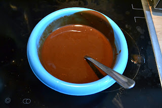 Melt chocolate and butter in the microwave together. Stir to combine.
